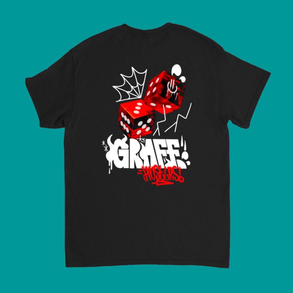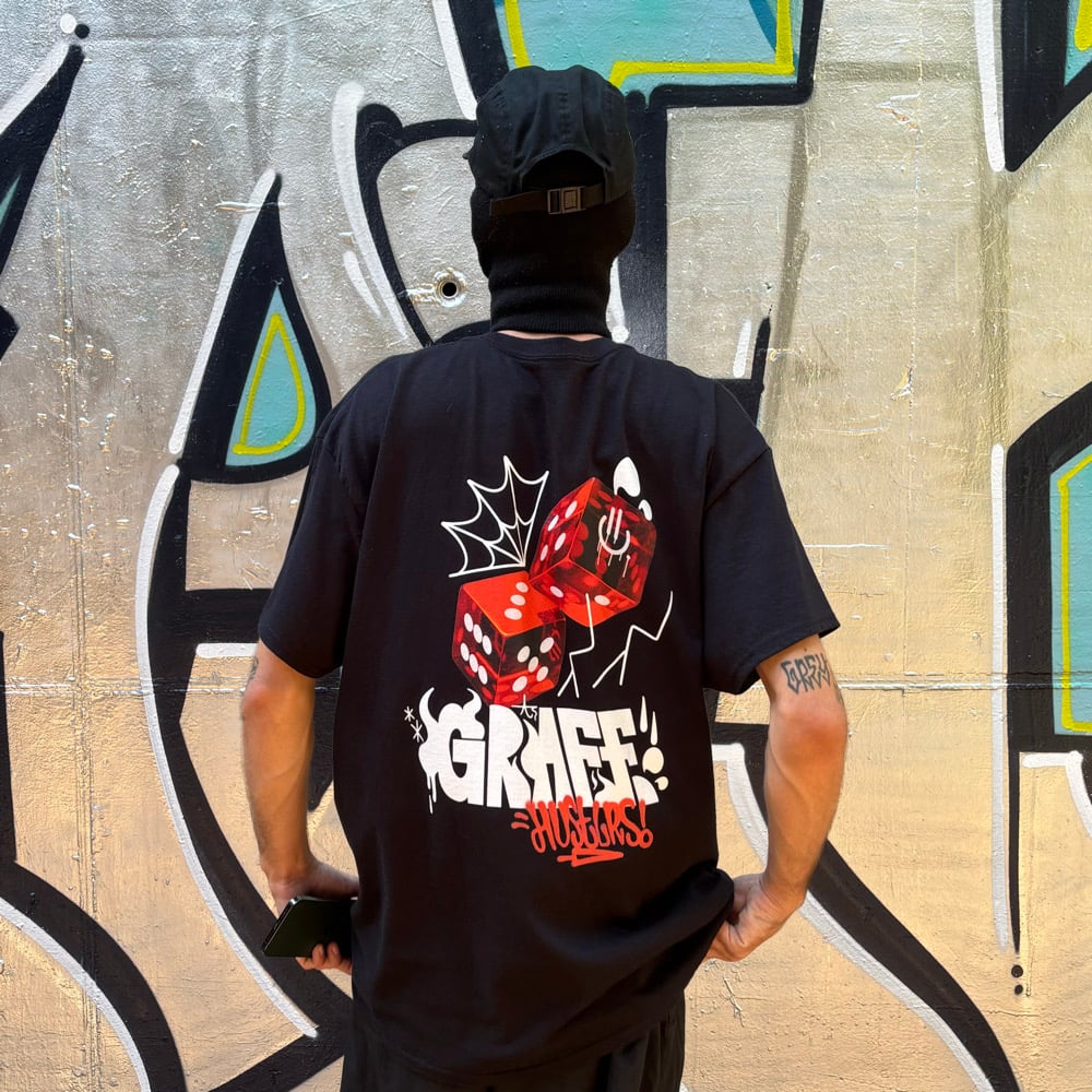 Level up your streetwear game with the Graffiti Hustlers tee. Featuring bold graffiti-inspired artwork with striking red dice, web details, and a raw urban aesthetic, this piece represents risk, hustle, and creativity.