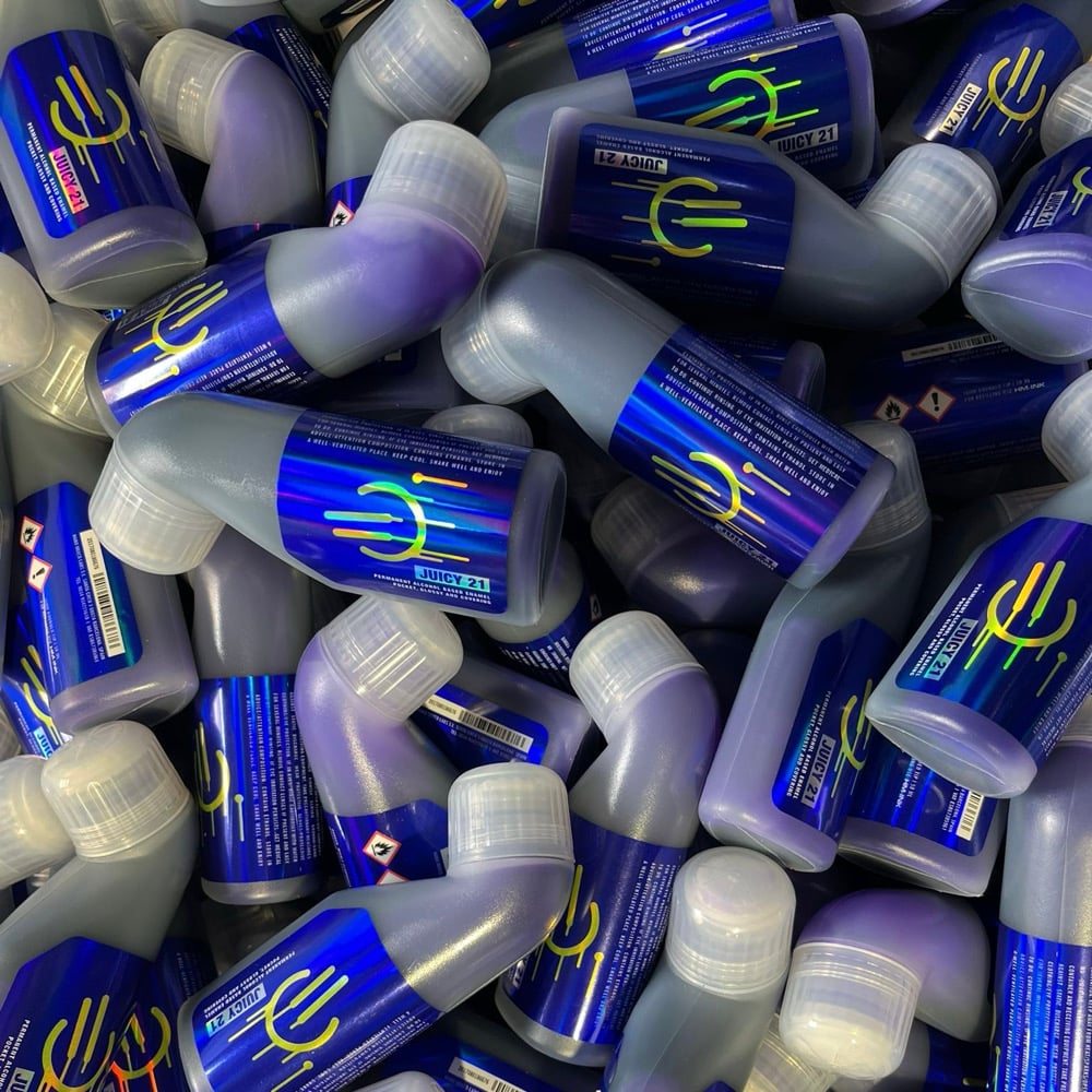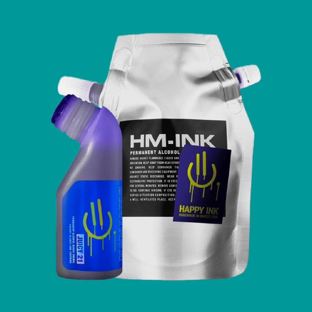 Imagine holding a small fire extinguisher in your hand. Vampiro Juicy Refill, feat Happy Ink. Innovative design. Flat, ergonomic, and silent. The new HM-INK container has two nozzles, one for refilling markers and another that shoots paint long distances when you squeeze the bag. Contains 100 ml of the popular Vampiro ink alcohol based cooked by Happy Ink, handmade in Barcelona.